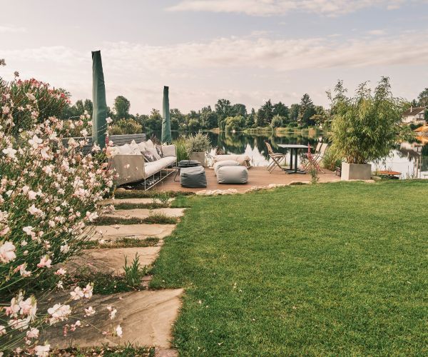 Der weitläufige Garten erstreckt sich entlang des Seeufers und offeriert einen atemberaubenden Seeblick. Die lebendige Vielfalt an blühenden Sträuchern und farbenprächtigen Blumenbeeten ergänzt die natürliche Schönheit der Umgebung und sorgt für eine lebendige Atmosphäre.