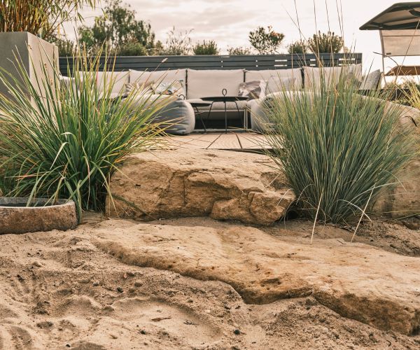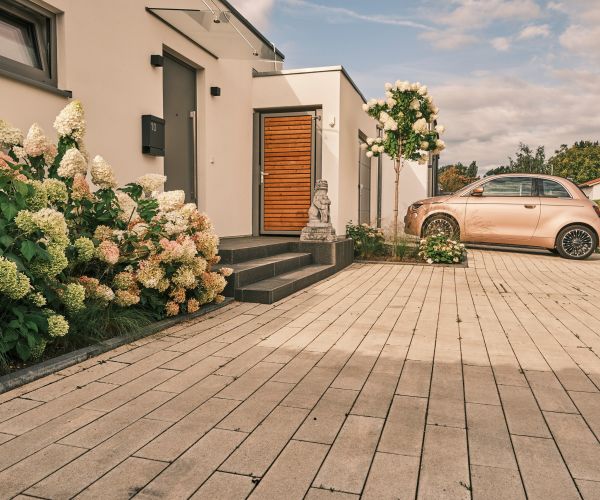Materialien | Sandstein, Cumaru Glattkantdiele, verblendete Mauerscheiben, Feinsteinzeug Fliesen |