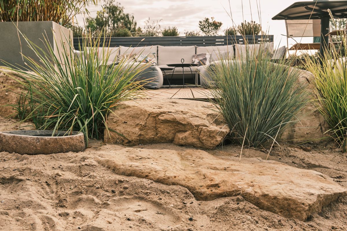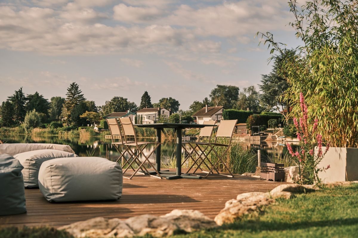 – Eine großzügige Loungeecke und bequeme Liegestühle, die zum Entspannen und Genießen der Sonne einladen, während das leise Plätschern des Wassers für Entspannung sorgt.