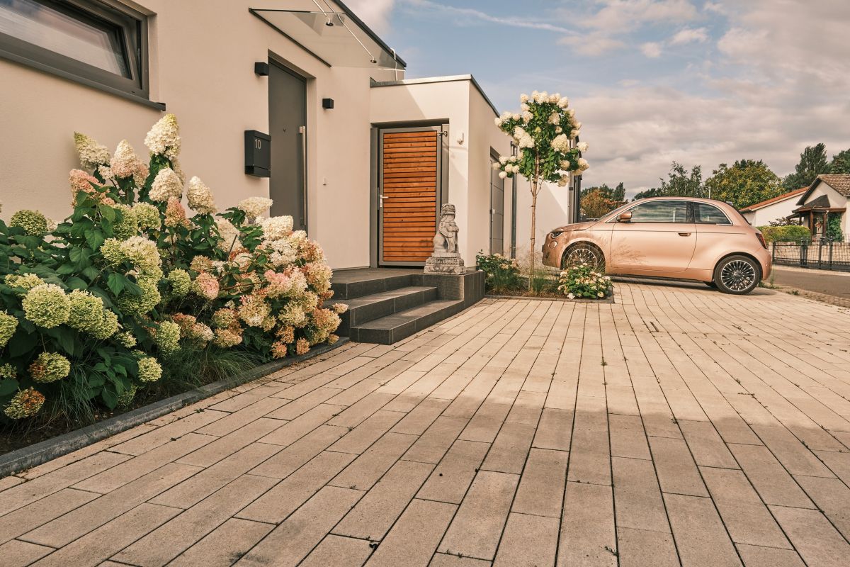 Materialien | Sandstein, Cumaru Glattkantdiele, verblendete Mauerscheiben, Feinsteinzeug Fliesen |